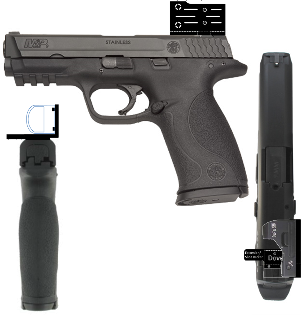 I have used traditional slide mounts in the past, and found it difficult to get the dot on target as fast as I would like. I practice primarily with an iron sighted .22 pistol, and having the HUD so high above the slide was giving me problems (primary issue is that the dot is so high and the base of the dot is so bulky that it eliminates any other visual references like the front sight or the front portion of the slide. secondly, because I practice with iron sights, trying to adjust my point of aim off the draw was just taking too much time and effort)). Looking around the shooting world for inspiration, I noticed a lot of people using 90degree optic mounts for their Cmore slide rides, and decided to borrow the concept and adapt it to the M&Ps rear right dovetail. This way, I keep the slide and front sight in my peripheral vision as references and keep the dot as close to the bore as possible. Fortunately, the left side of the STS is flat and facilitates this. What I came up was this (not to perfect scale, I know):
